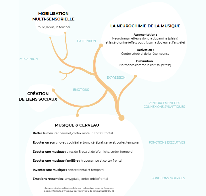 « Les bénéfices thérapeutiques de la musique tiennent certainement à sa composante hédonique et émotionnelle couplée à son rôle dans la communication et le lien social, dont les patients manquent souvent. »